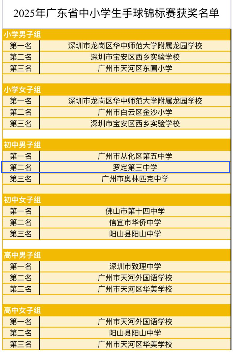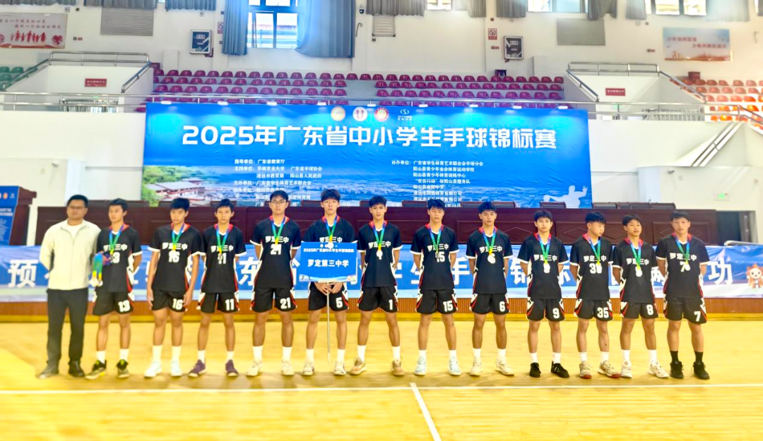 11月21至23日,2025年广东省首届中小学生手球锦标赛在清远阳山县举行。罗定第三中学男子手球队在中学男子组五人制项目中脱颖而出,从全省劲旅的激烈角逐中斩获亚军,以青春热血为校争光,在广东校园手球发展史上留下亮眼印记。