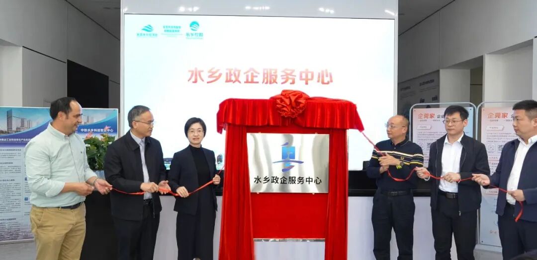水乡经济区党工委副书记、管委会主任卢伴章,市政务和数据局副局长陈钊,水乡经济区党工委委员、管委会总经济师陈暖培,麻涌镇副镇长何伟强,东莞水乡投资控股有限公司董事长卢耀海,以及中铁南方(东莞)公司总经理张嘉壮共同为水乡政企服务中心揭牌。