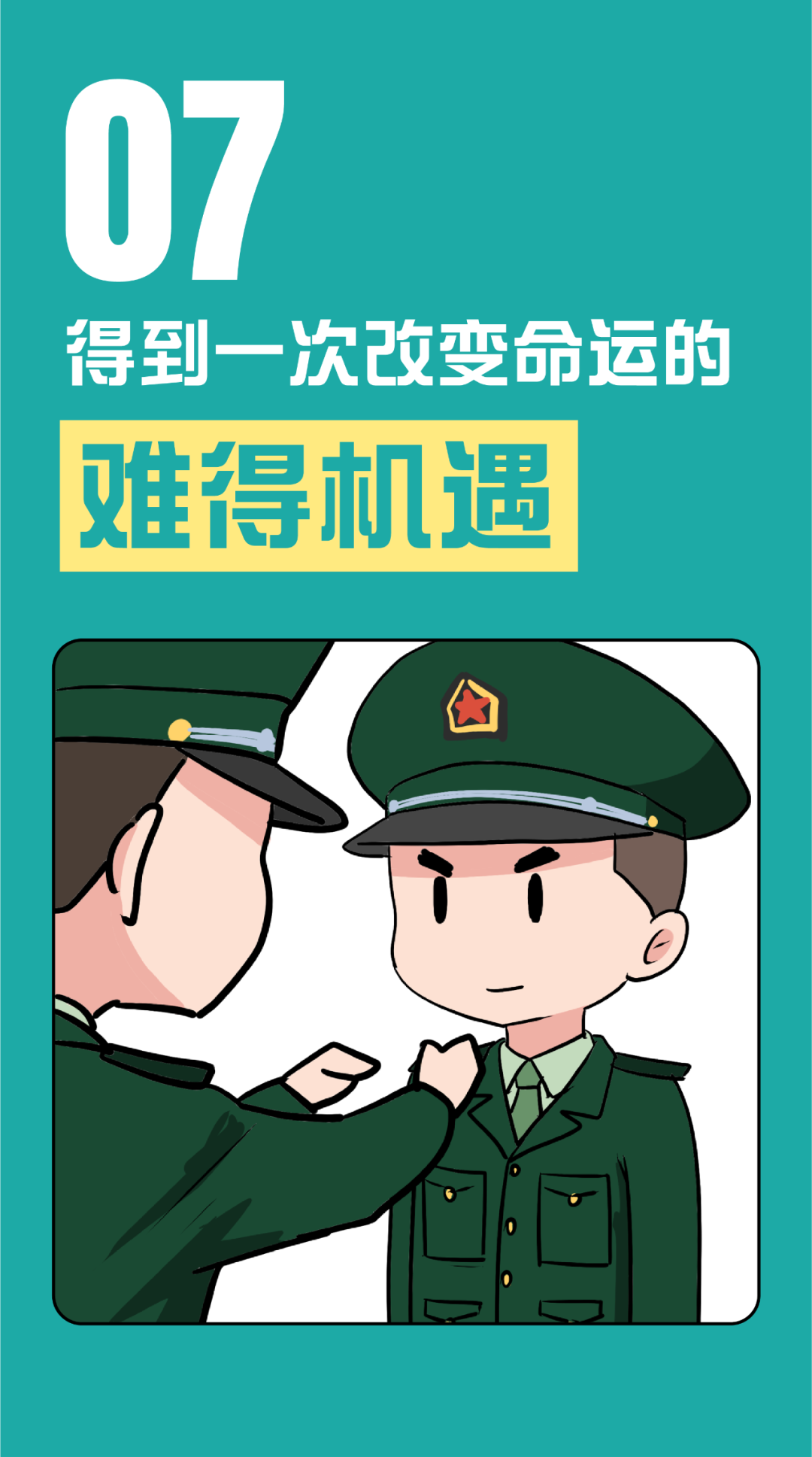 小伙伴们进入部队后,有很多可以改变人生轨迹的机遇,要注意把握。《中华人民共和国兵役法》明确,义务兵服现役期满,根据军队需要和本人自愿,经批准可以选改为军士;服现役期间表现特别优秀的,经批准可以提前选改为军士。不仅如此,符合条件的大学生士兵还可以通过报考或保送军校、优秀毕业生士兵提干等方式,走上军官发展道路。