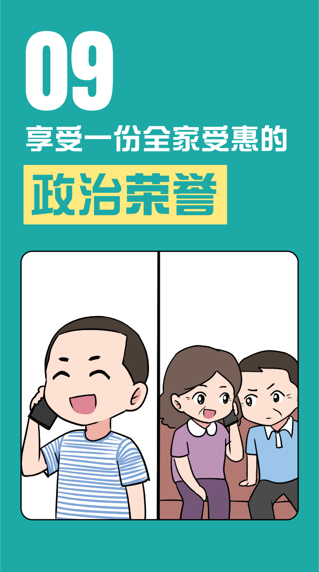 一人当兵,全家光荣。国家为保障军人军属权益专门出台了相关政策,不仅为义务兵家庭悬挂“光荣军属牌”、上门送喜报;同时,优抚医院为现役大学生士兵父母提供优惠体检,享受免收普通门诊挂号费和优先就诊、检查、住院等服务。陕西省还发布了文旅优待目录清单,持有相关证件的军人军属和退役军人皆可享受相应优惠优待。