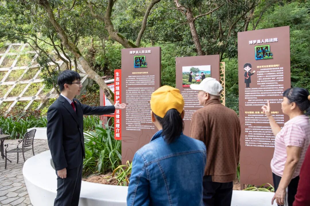 ▲博罗县法院生态环境司法服务点外,干警在向群众介绍环保法律知识。