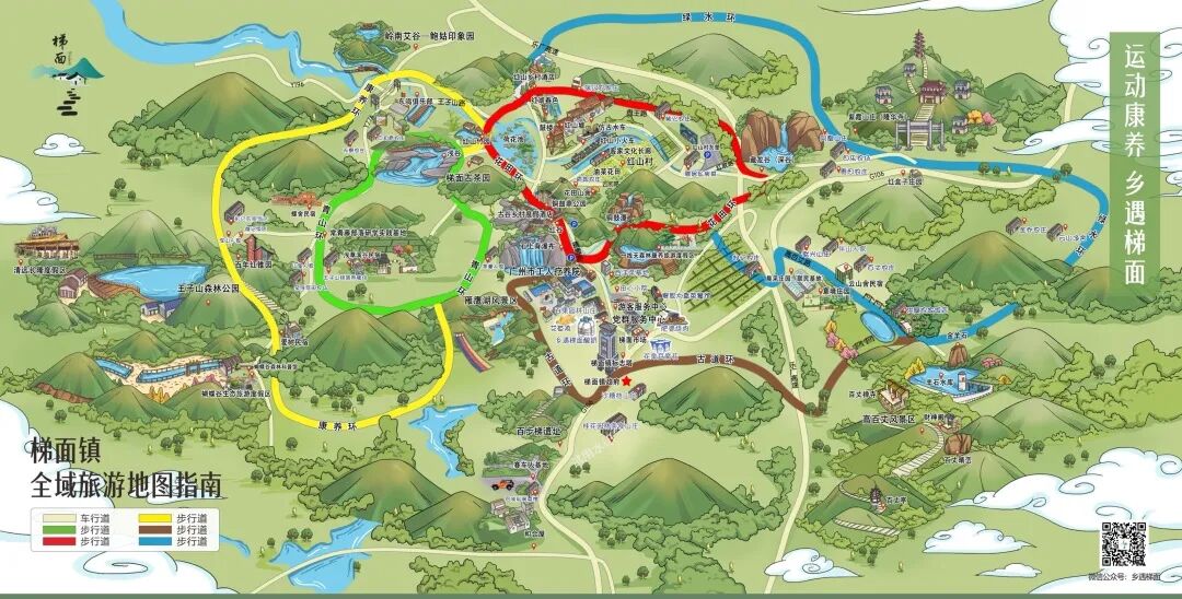 为了全方位匹配五环步道,梯面还精心推出8条精品旅游线路和“环王子山100”骑游路线:游客可沿“繁花叠瀑观景线”徒步,在花海瀑布间感受自然芬芳;挑战“森氧骑行线”,穿梭于森林覆盖率高达83.5%的青山绿水间;或选择“醉氧欢乐跑”,在负氧离子充盈的步道上畅快奔跑……这些线路深度融合花田、古道、康养等主题,更让“梯面氧你”的品牌形象深入人心。