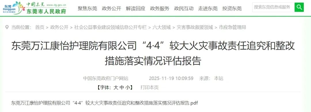 《东莞万江康怡护理院有限公司“4·4”较大火灾事故责任追究和整改措施落实情况评估报告》