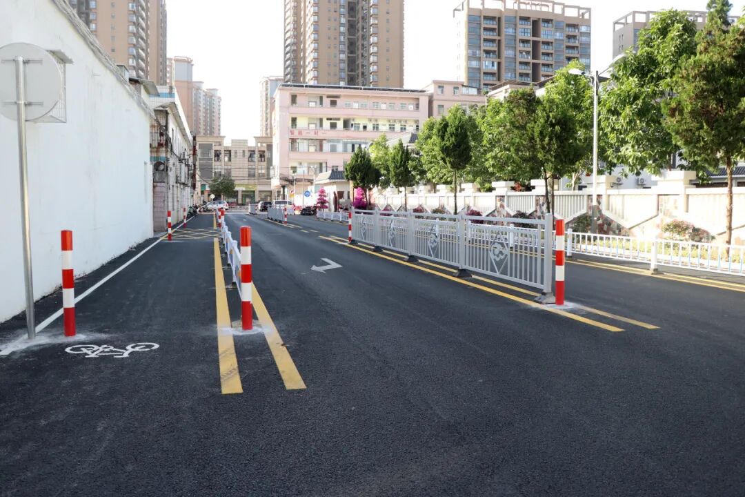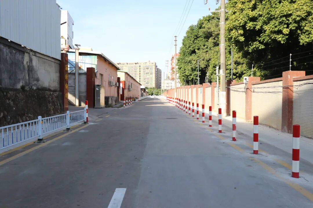 小编在大朗一中北门周边路段看到,原本杂乱的路面已焕然一新,新铺设的沥青路面平整干净,道路两侧规范划定了黄色标线与非机动车道专用道标识,白色隔离护栏清晰分隔出通行区域,红白相间的警示桩有序排列。