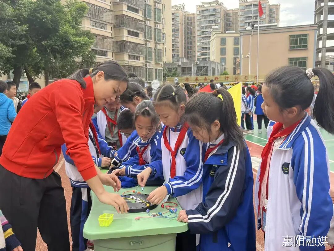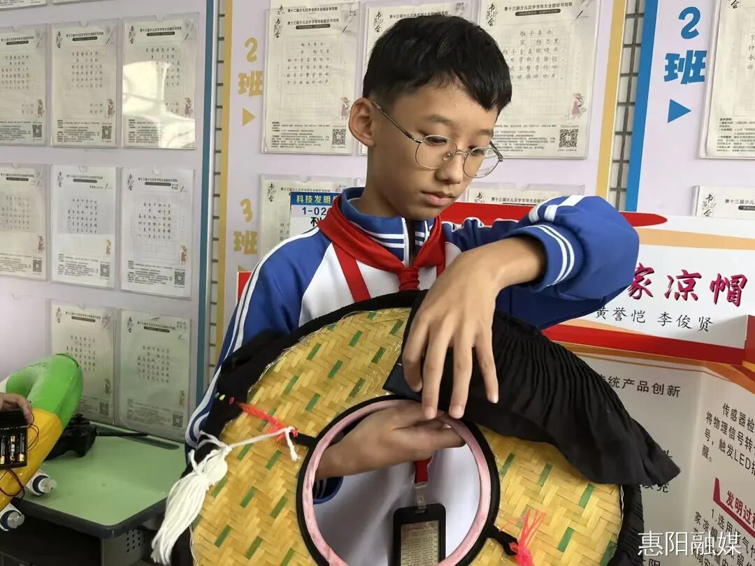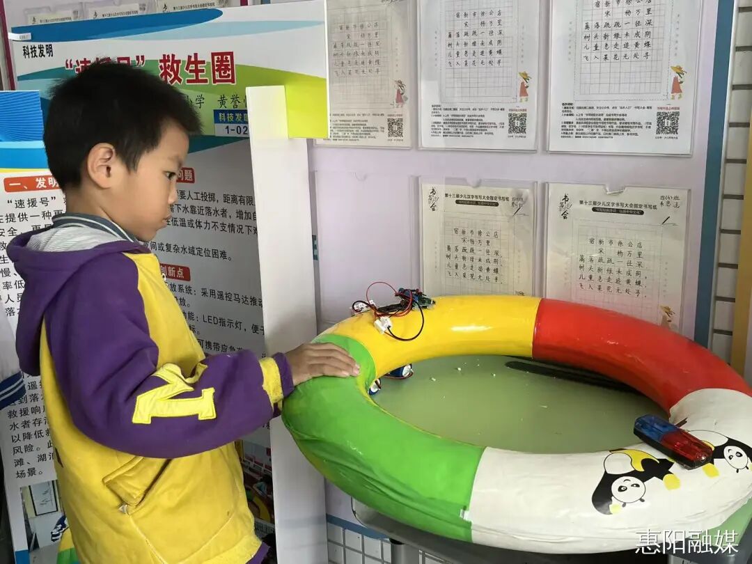在静态展示区,学生们的科技小发明、未来科幻画、变废为宝创意作品整齐陈列,从客家凉帽清凉神器,到“速援号”救生圈,一件件充满巧思的作品,充分展现了青少年创新思维与实践动手能力;互动体验区的模型车操控、无人机飞行展示等前沿科技项目,更是让学生们近距离触摸科技前沿,激发探索科学奥秘的浓厚兴趣。