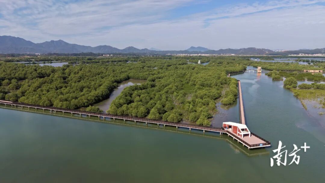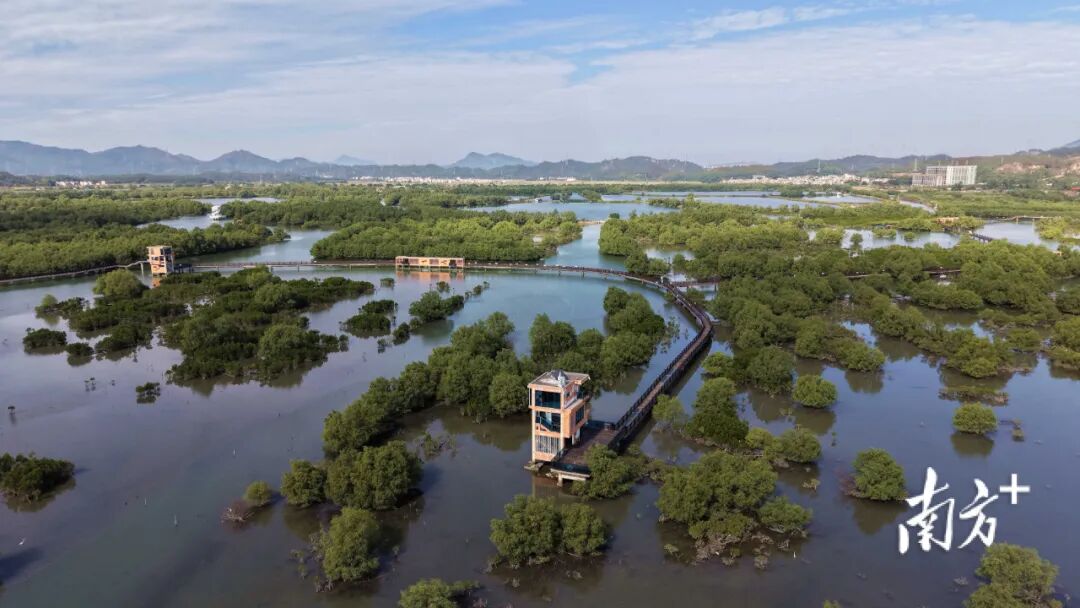 如今,好招楼湿地公园种植了800多万株红树林,并修建了沿岸景观栈道、观鸟亭和监测站等设施。这处历经过年打造的湿地公园,正筑起牢固的海上生态森林,净化水质,吸引鹭鸟栖息,成为科普教育和生态旅游的佳处。