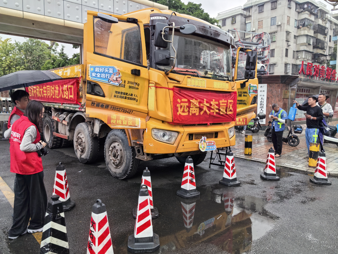 活动还为2025年大石街交通劝导“主理人”代表颁发了奖牌和礼品,肯定他们在辖区交通文明引导工作中作出的积极贡献。在互动体验区,民警在泥头车车头前方摆放了多个雪糕桶,令不少首次坐上泥头车驾驶位的参与者,真切感受到了司机的视野盲区。一名参与者体验后坦言,坐在泥头车内时,车头前的多个雪糕桶完全看不到,这让她意识到远离大车的重要性。
