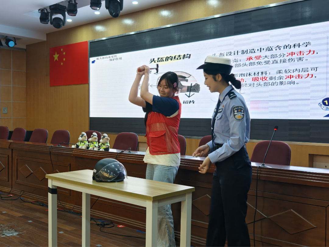 “通过此次活动,我学到了骑电动自行车要戴安全头盔,看见大车要主动避让,一定要远离大车盲区。”大石街志愿者黄京分享感悟时提到,“锤头盔”实验让她印象尤为深刻:“我刚才用了很大的力气砸头盔,头盔也没事,但要是没戴头盔,人的脑袋肯定会受重伤。”她表示,会把活动中学到的知识分享给身边人。