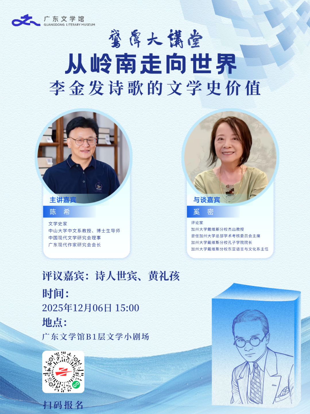 12月6日(本周六)15点,广东文学馆鹅潭大讲堂重磅开讲!我们将邀你一起,潜入百年诗潮深处,打捞被遗忘的文学瑰宝,重新发现“从岭南走向世界”的诗意传奇。