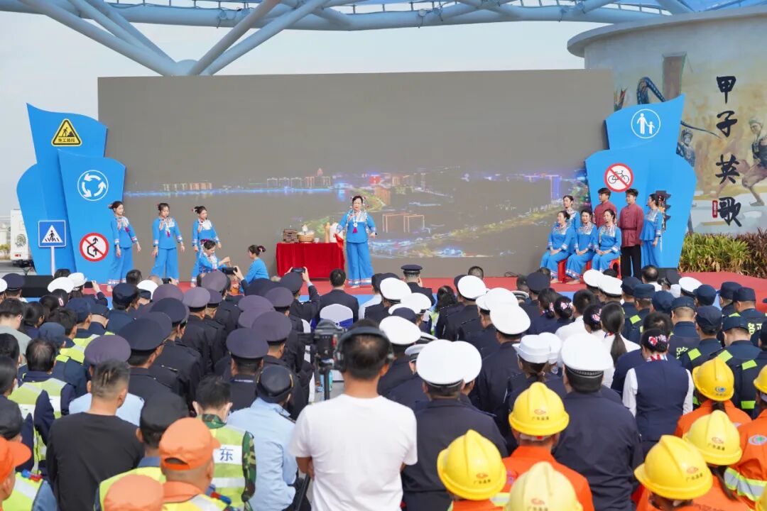 首先登场的是城区金帆渔歌表演队带来的《说唱交通安全+擂咸茶》,一登场瞬间点燃了全场气氛。汕尾渔歌和擂茶技艺都是非物质文化遗产,有着悠久的历史文化沉淀,把交通安全知识通过汕尾渔歌演唱的方式进行宣传,让观众在欣赏渔歌的同时学到交通安全知识,并提升交通安全意识。