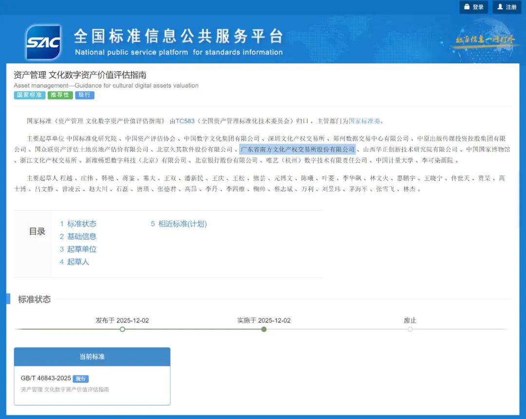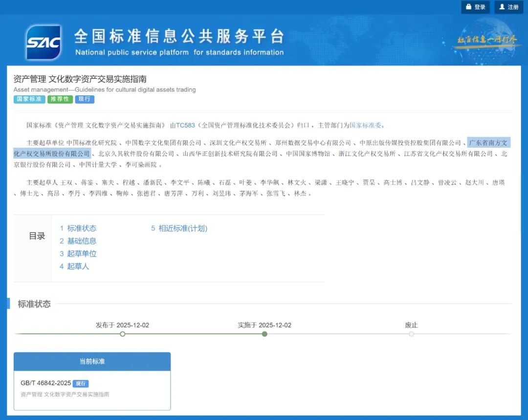2025年12月2日,由南方文化产权交易所深度参与起草的两项国家标准——《资产管理 文化数字资产价值评估指南》(GB/T 46843-2025)与《资产管理 文化数字资产交易实施指南》(GB/T 46842-2025)正式发布并同步实施。这两项标准的实施,标志着我国在文化数字资产领域从“自发探索”迈向“规范引领”的新阶段。