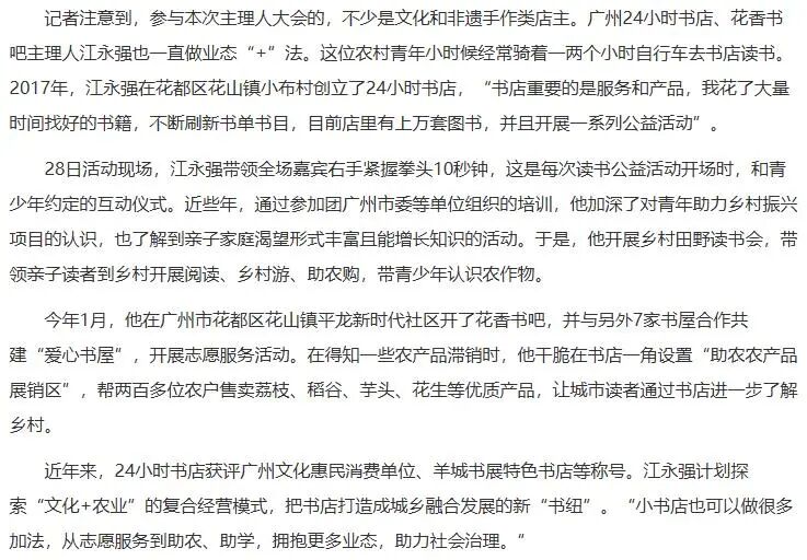 记者注意到,参与本次主理人大会的,不少是文化和非遗手作类店主。广州24小时书店、花香书吧主理人江永强也一直做业态“+”法。这位农村青年小时候经常骑着一两个小时自行车去书店读书。2017年,江永强在花都区花山镇小布村创立了24小时书店,“书店重要的是服务和产品,我花了大量时间找好的书籍,不断刷新书单书目,目前店里有上万套图书,并且开展一系列公益活动”。