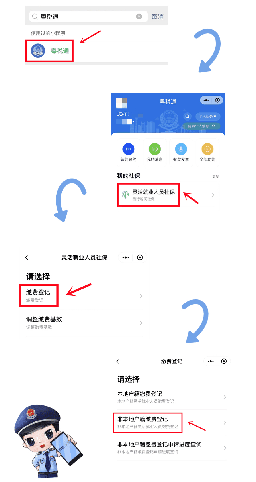 线上办:灵活就业人员可通过“粤税通”小程序—灵活就业人员社保—缴费登记—非本地户籍缴费登记模块,在就业地办理失业保险参保缴费登记。