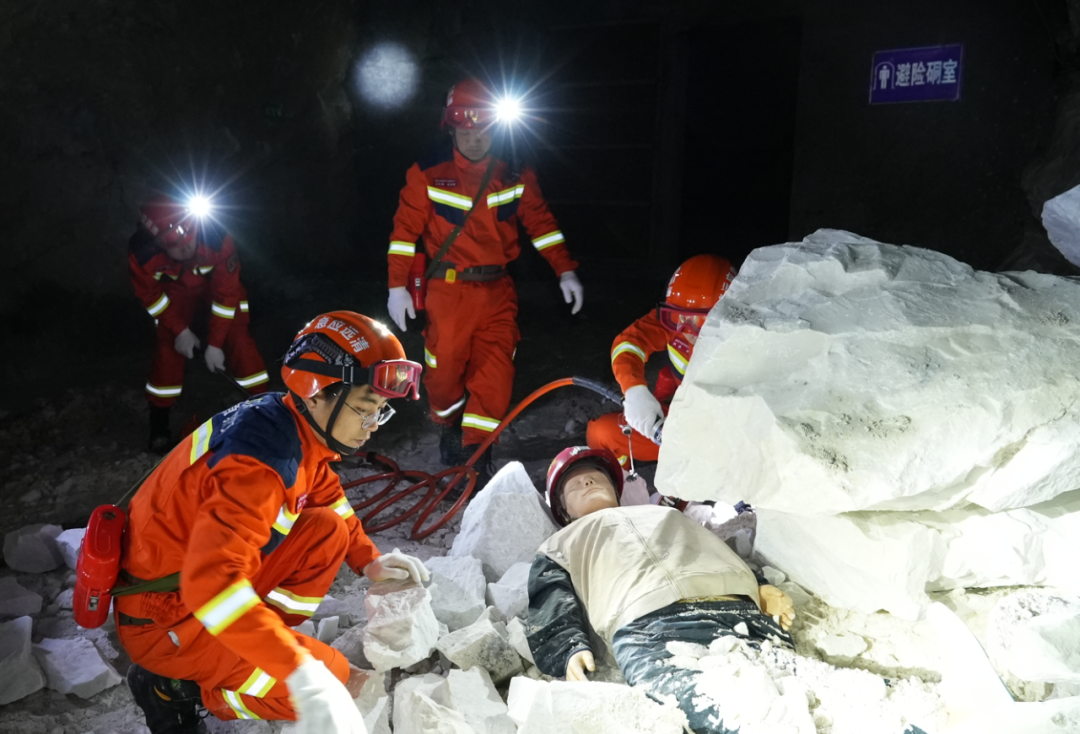 演练模拟2025年12月5日10时30分,连州市鹏盛矿业有限公司井下钻工班组正在+446m巷道进行作业时,巷道顶板传来异响,部分顶板冒落,一名钻工被冒落的石头压到腿部,无法撤离。其他井下作业人员迅速进行撤离,并报告值班室。企业值班员马上电话报告连州市安全生产委员会办公室及110、120、镇政府。随后,救援、医疗和警戒等各队伍纷纷抵达现场进行救援工作,在救援队伍将人员救出后,医疗救援员迅速为伤员进行紧急救治和转运。