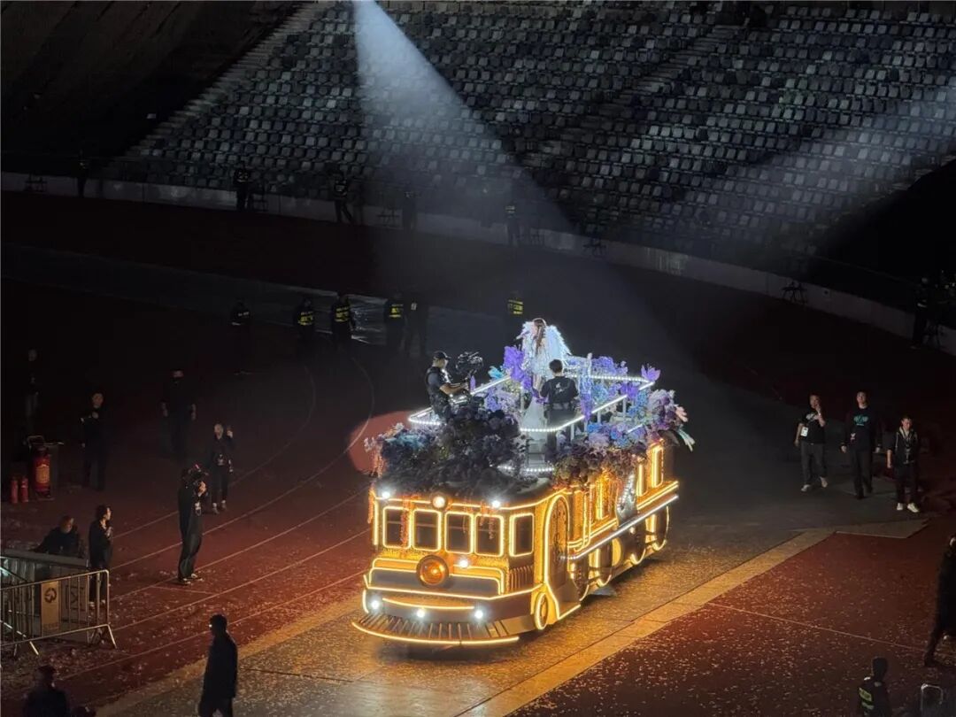 演唱会上,《欧若拉》《遗失的美好》《亲爱的那不是爱情》《看得最远的地方》相继唱响,熟悉的旋律唤醒观众心底的共振。备受期待的“觅光号——银河列车”花车巡游将气氛推向高潮。张韶涵乘坐花车穿越观众区域。花车上的紫色、蓝色的花卉交织成梦幻花簇,羽毛装饰点缀其间,把“银河”的浪漫与“觅光”的诗意交织在一起。《隐形的翅膀》与《有形的翅膀》并置出现,象征着从青春到成熟的蜕变。