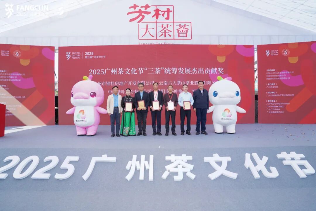 珠江波光潋滟,芳村茶香四溢。2025年12月5日下午,位于广州白鹅潭商务区的广东芳村茶业城彩旗招展,茶韵缭绕,处处洋溢着喜庆祥和的节日气氛。在全运会吉祥物“喜洋洋”和“乐融融”的欢快互动中,由广州茶业协会主办、广州市锦桂房地产开发有限公司协办的第三届广州茶文化节隆重开幕。这场以“文化赋能、精准触达、流量转化”为主线的茶业盛会云集行业精英,汇聚产业成果,将为茶文化传承创新和茶产业高质量发展注入新的活力。