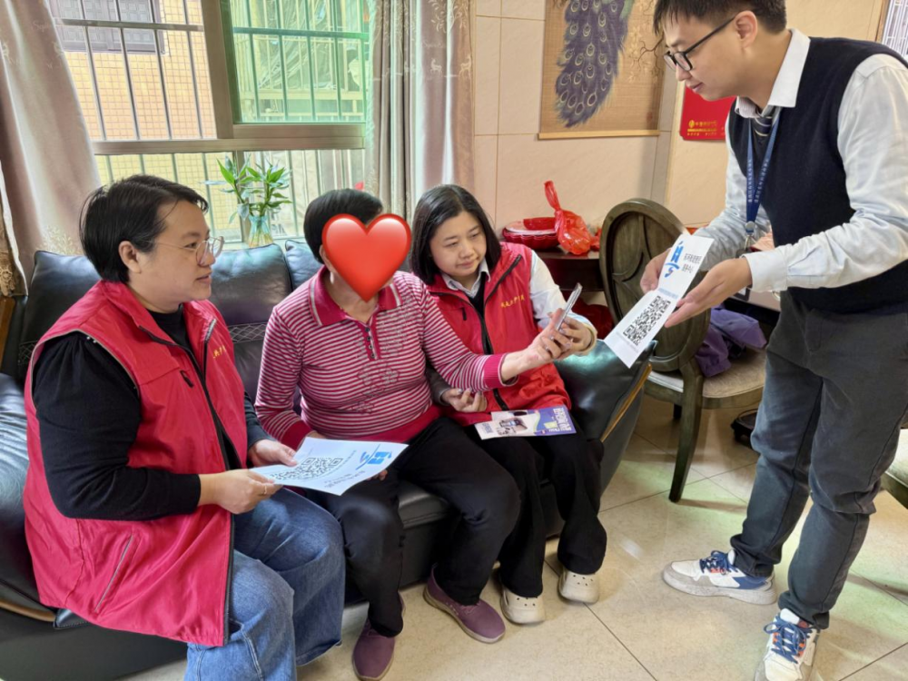 服务队上门走访村内行动不便的老人,现场通过“粤省事”小程序协助办理城乡居民基本养老保险待遇领取资格认证,并耐心向老人及家属演示介绍“政务晓窗”智能服务平台的操作方法。