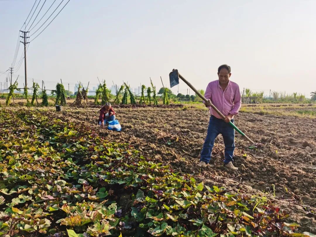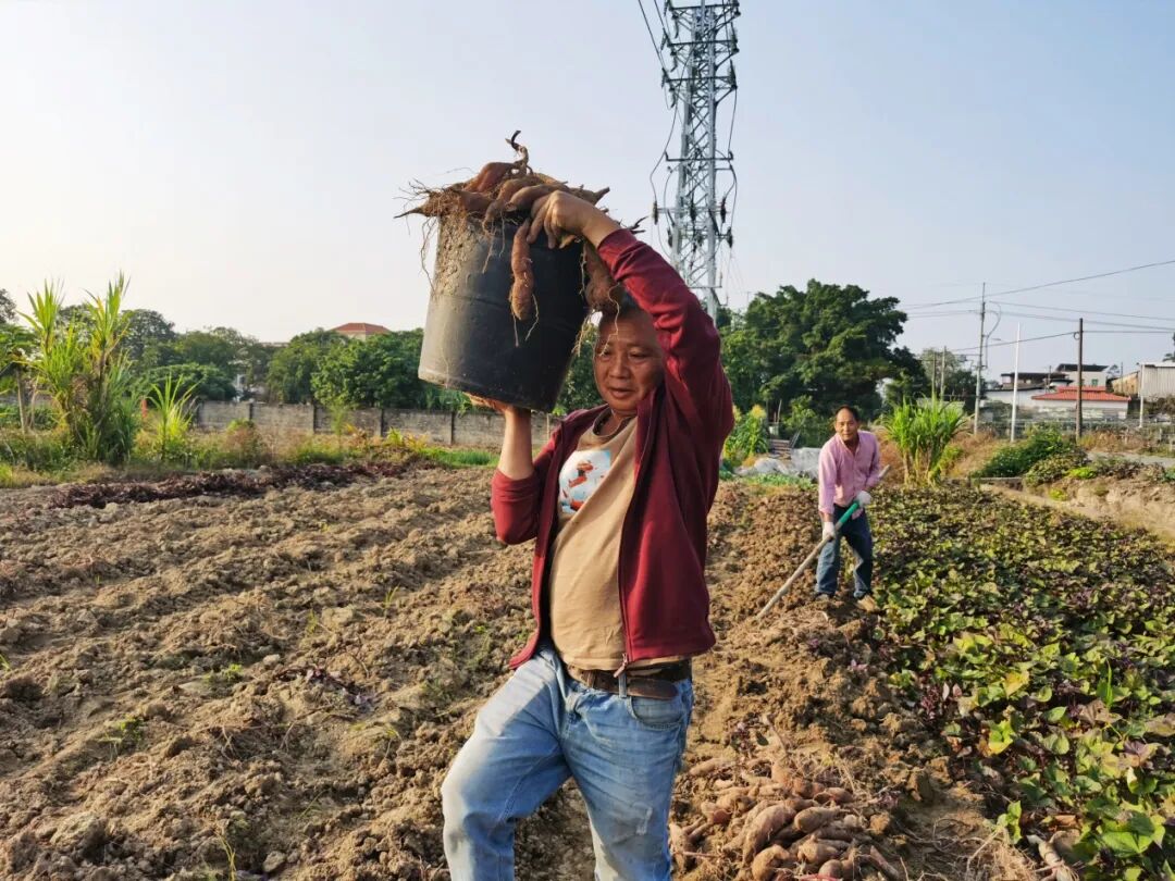 时下,正是番薯丰收的季节。在花都区炭步镇文二村的番薯种植地里,村民们两三人一组分工协作,忙着割藤、翻土,一个个饱满的番薯被挖出。