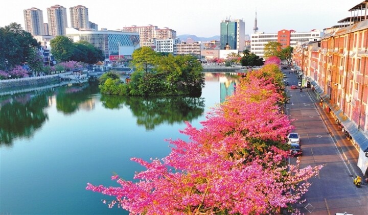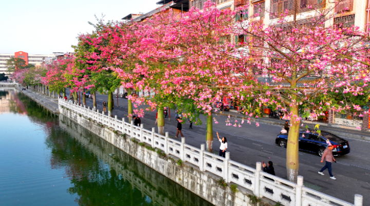 近日,河源市区鳄湖公园,一排排异木棉进入盛花期,红色及粉白相间的花朵缀满枝头,与澄澈湖光相映成趣,成为市民家门口的打卡胜地。