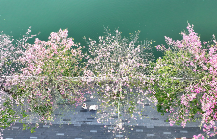 沿湖堤岸,高大挺拔的异木棉撑开“花伞”,粉色花瓣娇嫩明艳,白色花朵素雅清丽,层层叠叠如霞似雪。