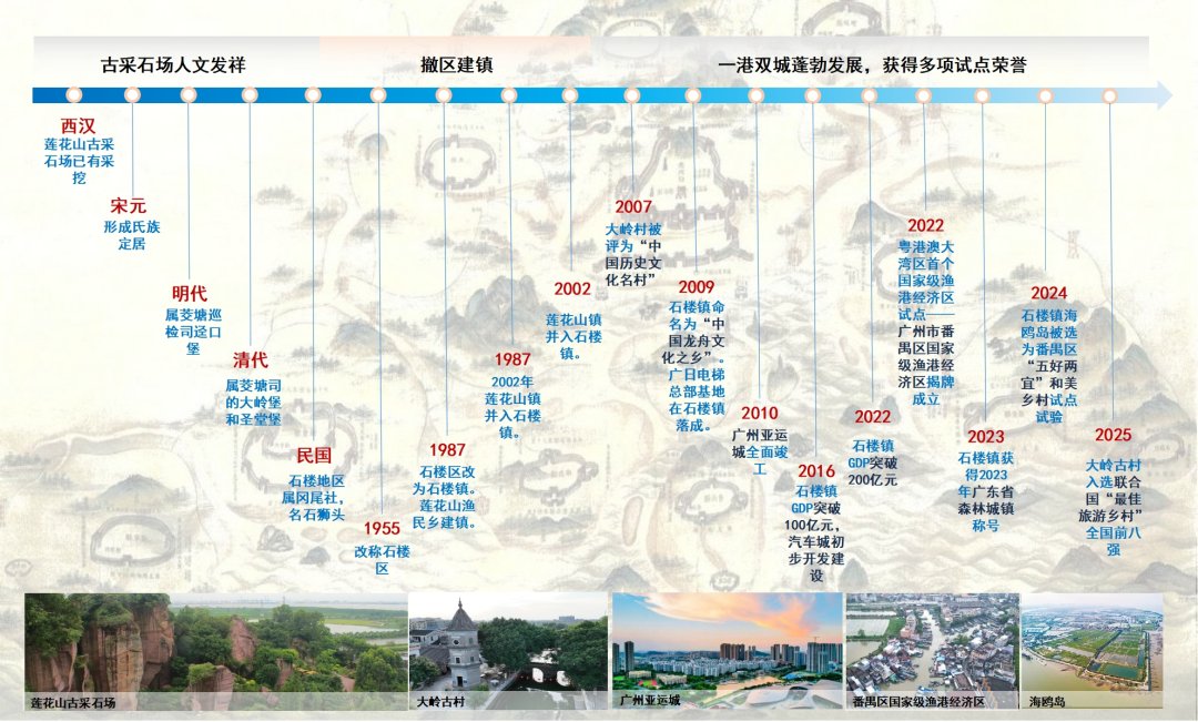 历史悠久的石楼在西汉时期已存在修建南越王宫的古采石场,古称“石狮头”。过去,这里以渔业和农业闻名,被誉为广州的“渔米之乡”;如今,这里已形成地区生产总值超260亿元、规上工业总产值超500亿元的产业规模,广州亚运会在此举办,广州市番禺区国家级渔港经济区在此揭牌成立,广汽集团、广日电梯等龙头企业接连落户,石楼连续跻身全国镇域经济“双百强”。