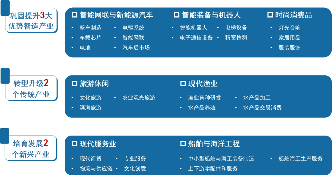为进一步加强石楼镇的产业优势,紧抓省、市、区关于制造业立市、海洋经济与现代服务业发展的战略机遇,结合广州市“12218”与番禺区“2104”现代化产业体系,深耕全镇三产基础,构建起石楼镇“3+2+2”现代产业体系。通过强化智能网联汽车、先进制造、现代渔业、文化旅游和现代服务业等核心产业集群,加速打造石楼融合创新、高效协同的产业生态,推动经济高质量发展。