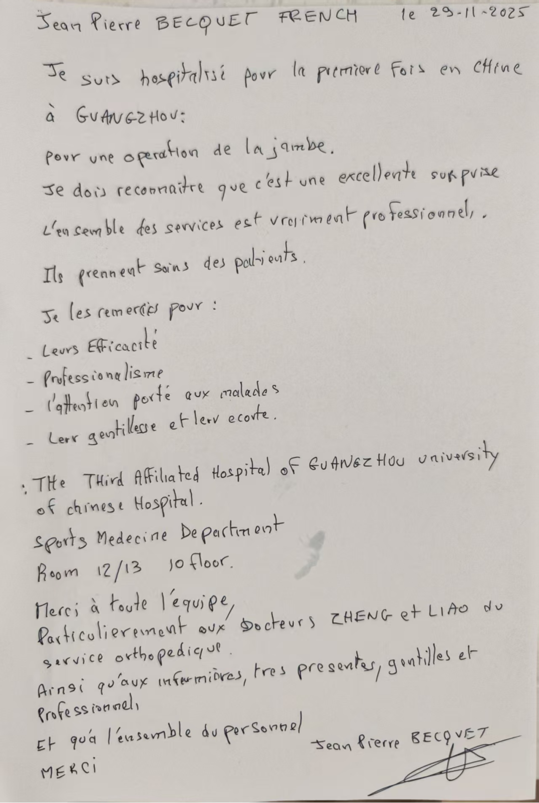 在关节中心运动医学科,医护团队始终相信:精湛的医术与真诚的关怀,是全世界共通的语言。近日,一封来自法国患者Jean的手写感谢信,再次印证了这一点。