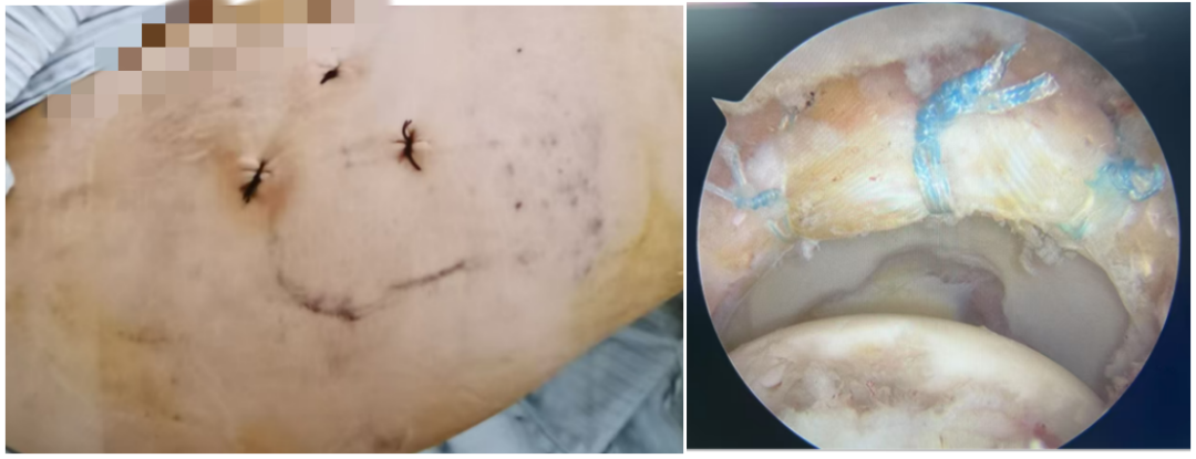 手术当天,通过2个不到1厘米的钥匙孔般大小的切口,置入关节镜。在高清显示屏放大下,关节内情况一目了然,团队为其精准地修复好受损的盂唇,并磨除撞击的骨质。手术顺利完成。