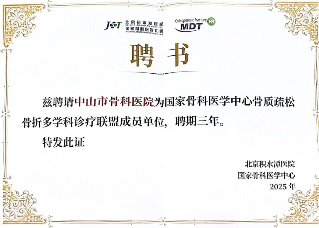 2025年11月,中山市骨科医院正式与国家骨科医学中心(北京积水潭医院)签约,成为国家骨科医学中心骨质疏松骨折多学科诊疗联盟成员单位。这是继加入智能骨科分联盟、缔结跨省专科联盟、落地五大北京专家工作室后,我院在整合国家级骨科优质资源、完善专科诊疗体系上的又一重要突破,标志着医院在骨质疏松骨折多学科规范化诊疗领域迈入 “国家级协作阵营”,将为中山及周边地区骨病患者带来更精准、全面的诊疗服务。