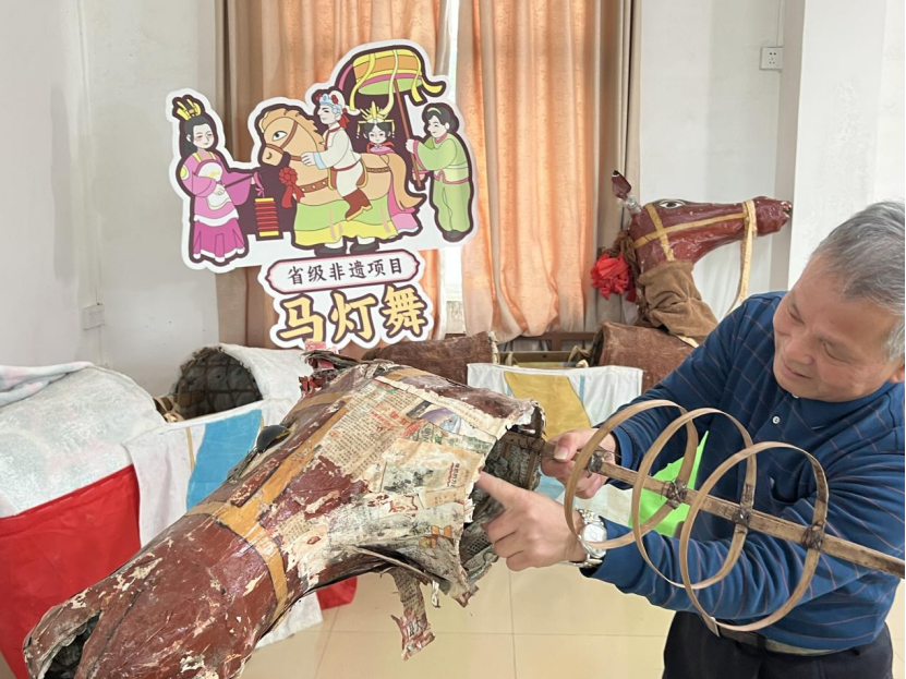 说起马灯舞的林林总总,马灯舞老一辈艺人、龙川县杂技木偶山歌艺术团老团长杨作炬娓娓道来,如数家珍——马灯舞演出所用的道具既有竹篾编制、纸糊表面的竹马,也有形态各异的灯笼,因“打”字在客家方言中有“举行”、“表演”等意思,故被取名为“打马灯”,后因有专业团体演出而被称为“马灯舞”。马灯舞表演时,演员通常用彩旗、锣鼓等辅助道具,营造热烈喜庆的氛围,表达客家人对美好生活的向往。身着传统服饰、身扛竹马的演员们,伴随着节奏明快的锣鼓声起舞,动作矫健韵律十足,浓厚的民俗风情里蕴藏着中原文化的深远影响。有趣的是,按照祖辈传下来的规矩,这些竹制道具在每年春节演出结束后就会被全部烧掉,来年演出时候用竹篾重新制作新道具。