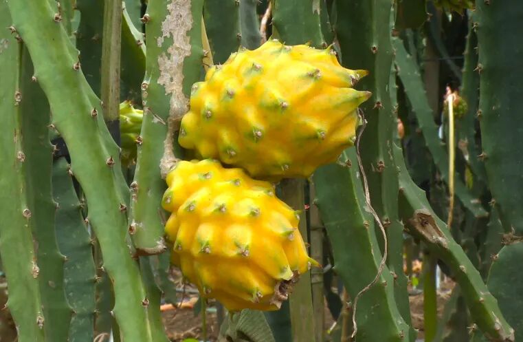 在金鸡镇的燕窝火龙果基地,一颗颗金黄色的果实挂满枝头,散发着诱人的香气。村民们或穿梭其间采摘成熟的火龙果,或忙于分拣、包装,处处洋溢着丰收的喜悦。“燕窝火龙果,进入丰收期,今年受天气影响,比去年减值一点。”罗定市金鸡镇志臻燕窝火龙果种植场负责人郭志强表示。