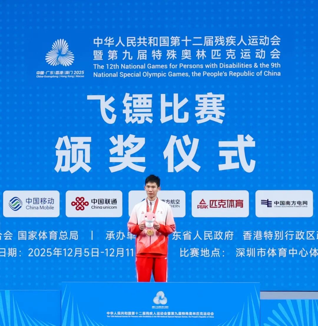 12月9日,在2025年残特奥会飞镖(大众)项目智力残疾组男子单打决赛中,来自珠海的孤独症少年邱安呈一举夺魁,为广东省赢得了该项目有史以来的第一枚全国残特奥会金牌!