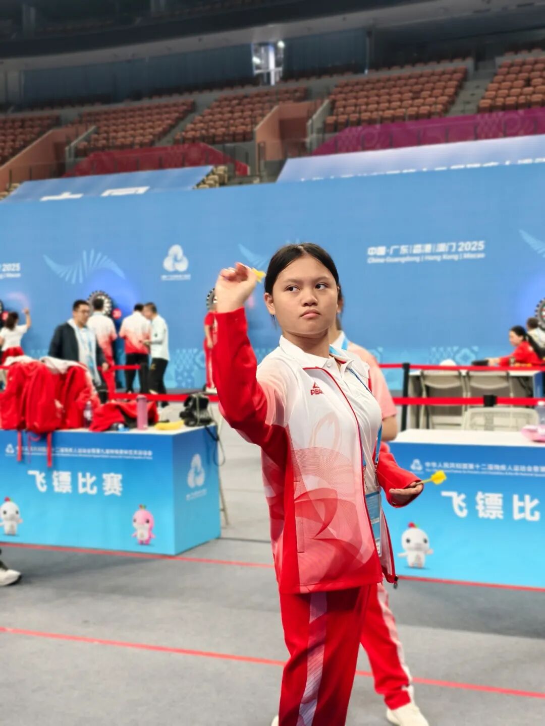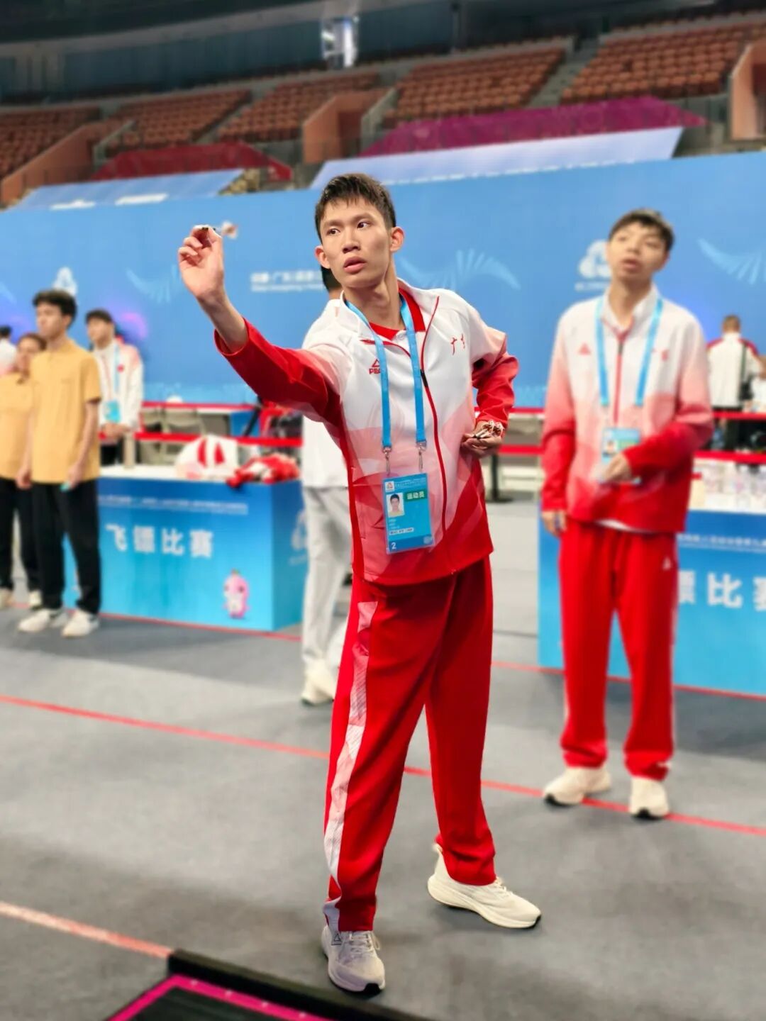 决赛现场,气氛紧张。面对强劲对手,邱安呈展现了超乎年龄的沉稳。每一镖都深思熟虑,最终一击定乾坤,全场沸腾。这枚金牌,填补了广东省在该项目上的历史空白。