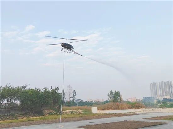 测试现场,鹤山市应急救援大队携专业救援装备,在企业试飞场地开展实战测试。此次测试重点验证大载重无人机挂载消防水带后,实现高空悬停、持续大流量喷水的能力。在技术人员完成机身水枪加装、水囊蓄水、消防水带接驳等准备工作后,无人机操作员全神贯注紧盯操控屏,指尖精准操控摇杆,实时校准飞行参数。当无人机平稳挂载消防水带升至预设高度并悬停定位后,一道强劲的“水龙”从高空骤然喷射而出,精准覆盖目标区域,首次高空出水测试圆满成功。