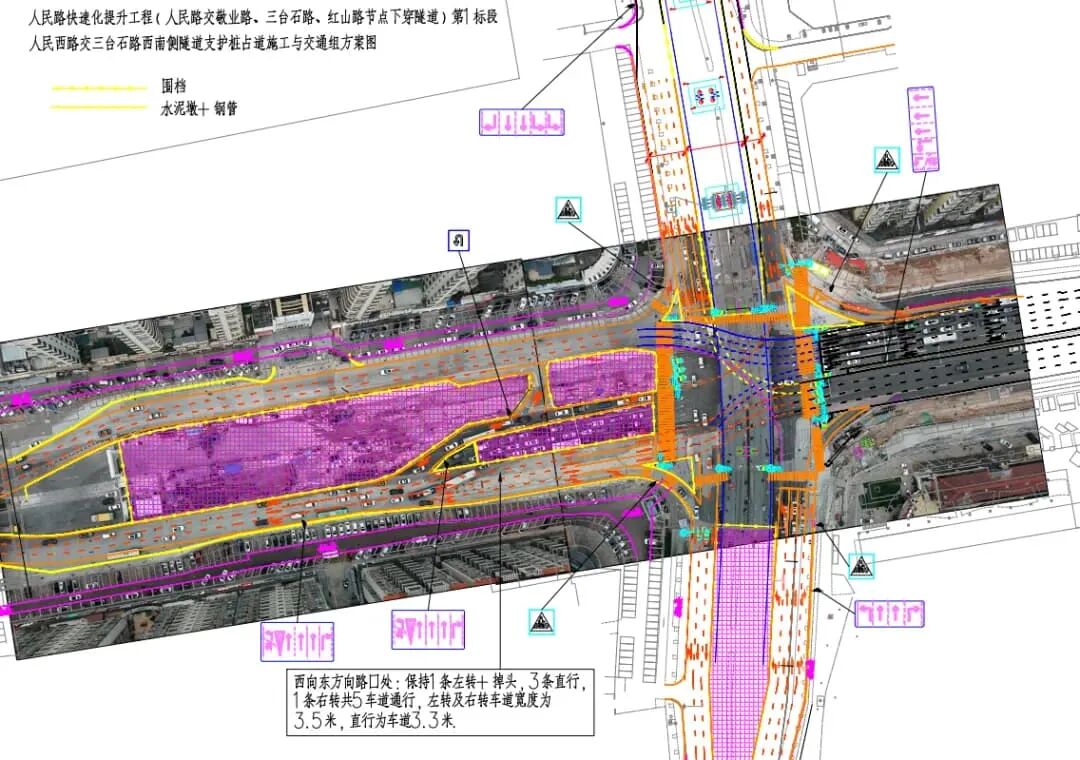 2、人民路西往东方向路口处:原有2条左转车道调整为1条左转(可掉头),3条直行车道由安居园公交站(西向东方向)顺直至路口,右转车道保持不变。共保留5车道通行,左转及右转车道宽度为3.5米,直行车道3.3米。