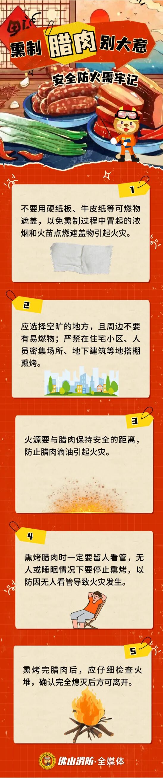 2024年1月3日,清远市阳山县某小区一居民房阳台着火。起火原因是生活用火不慎,户主熏制腊肉时中途离开,腊肉脱落掉至火堆中从而引发火灾。