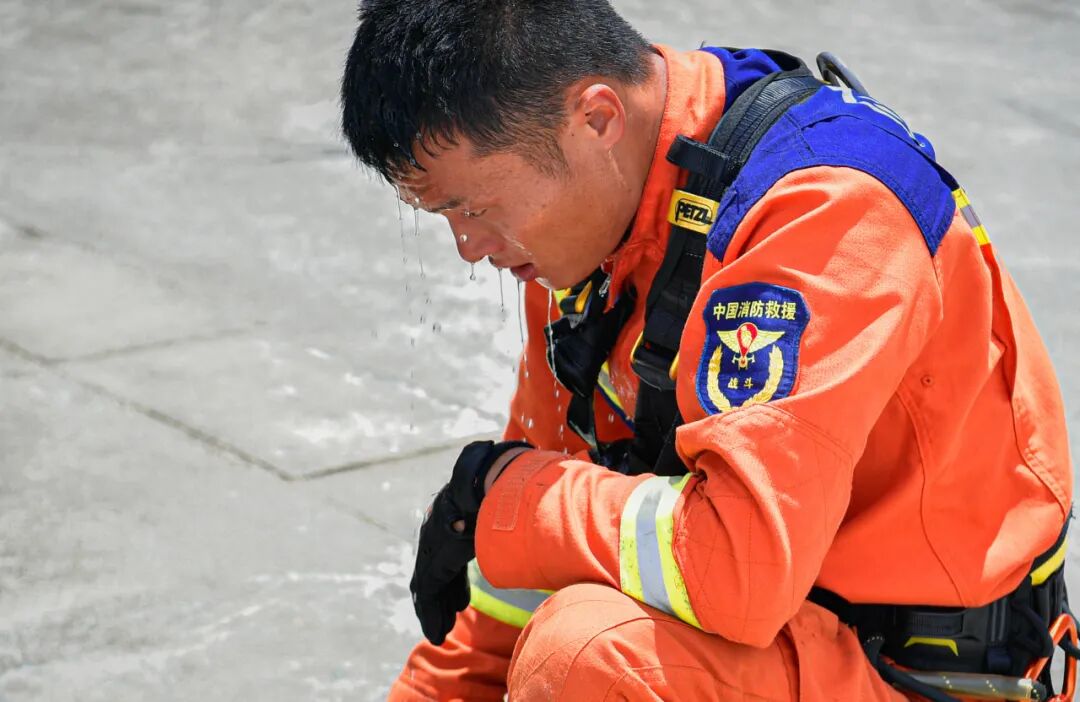 一名消防员训练后蹲踞,汗水垂落,手攥水瓶。烈日下的艰苦训练,诠释了其使命担当。