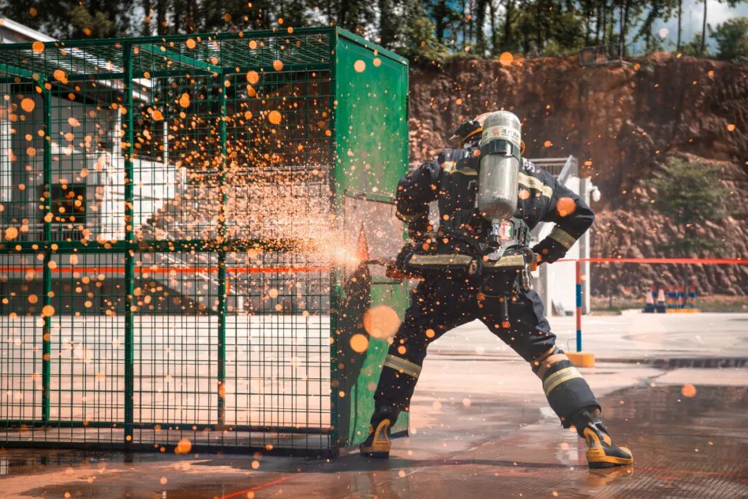 在一次消防技能比武中,一名消防员身披防护装备,背负气瓶,进行切割破拆,四溅的火花似金色雨点飞扬。这一瞬间,不仅是技能的淬炼,更是守护生命的誓言。