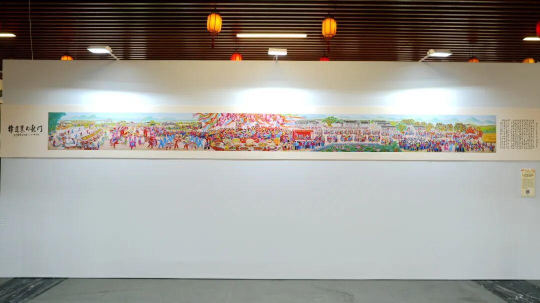值得一提的是,被誉为农民画版的“清明上河图”的龙门农民画长卷《非遗里的龙门》以宏大的叙事格局与细腻的笔触刻画,成为展览核心亮点,极具吸引力。它将舞火狗、做棚、上灯等特色民俗,醒狮、春牛舞、舞龙、出凤等传统舞蹈,虎头花灯、织带仔、造纸、盒箩、酿酒等制作技艺,米饼、胡须鸡、大笼糍、西溪笋等非遗美食,串珠成链于13米长卷之上,40多项非遗瑰宝跃然纸上,人物神态栩栩如生,四时风俗热闹喜庆,山川景致清新宜人,全方位展现了龙门非遗的丰富内涵与独特魅力。