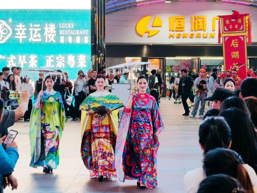 在文明集市促消费系列活动启动仪式后,龙门农民画旗袍秀、潮汕英歌舞、陆丰皮影戏等民俗表演,通过快闪等方式在北京路进行表演,吸引大量游客驻足观看,现场气氛热烈。