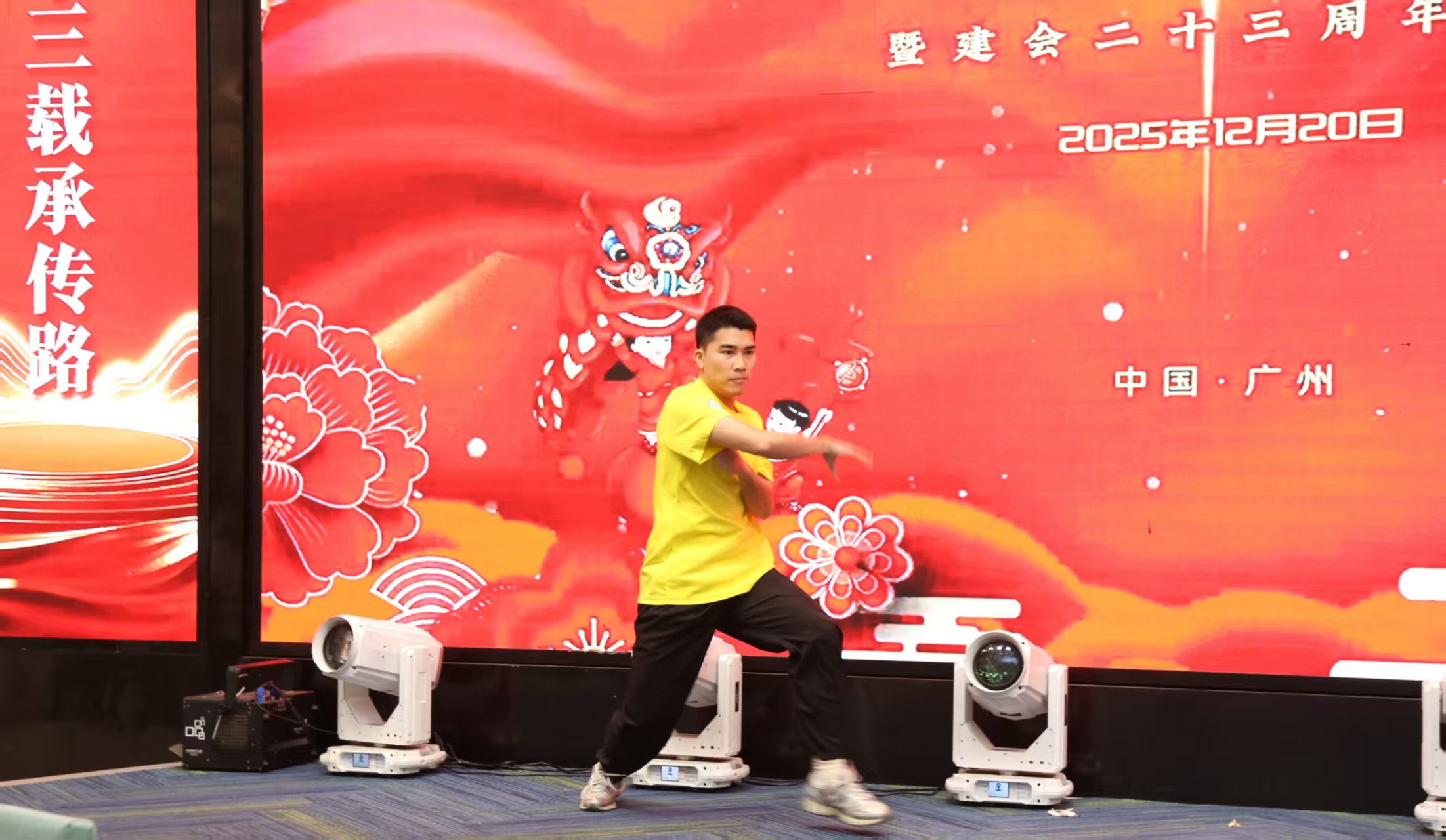 庆典议程丰富,在群狮献瑞的热闹氛围中拉开序幕。醒狮腾挪跳跃,鼓点铿锵激昂,瞬间点燃现场气氛。会上,胡健强会长发表致辞,回顾协会二十三年发展历程;监事员梁燕萍女士作年度财务收支报告,省武协副会长黄标等嘉宾也先后致辞,对协会发展给予肯定。随后,活动依次开展常务理事祝酒、团体会员队旗颁发、兄弟拳会互赠旗等环节,进一步凝聚行业交流合力。