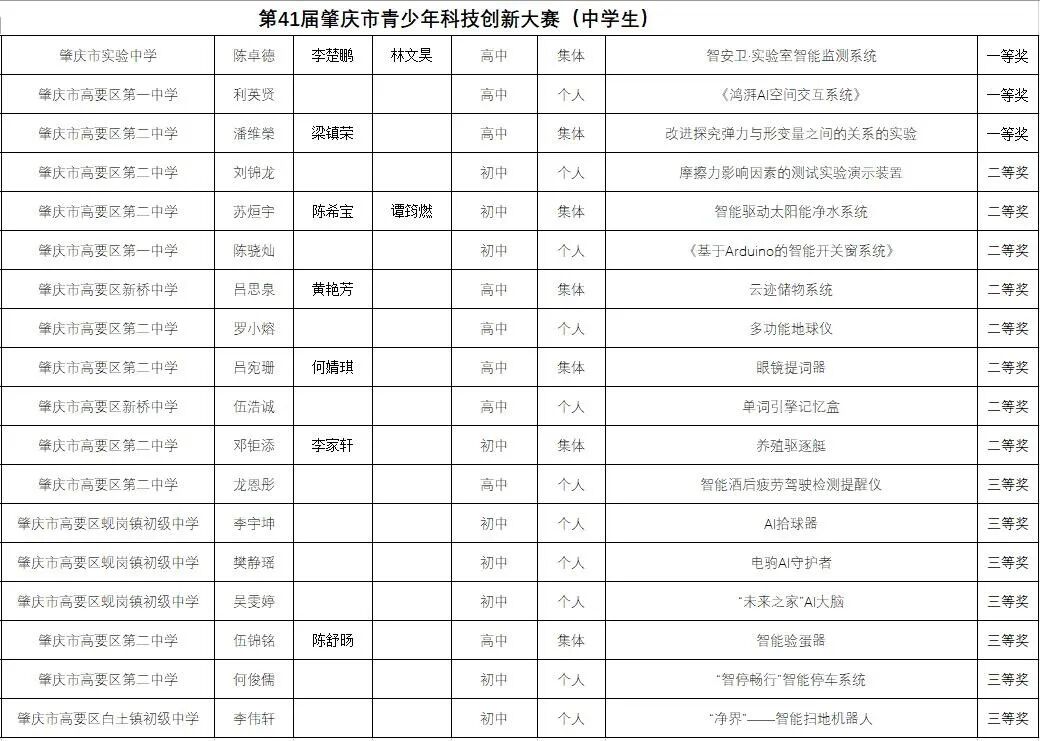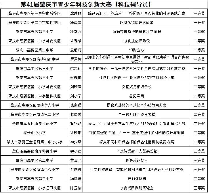 在近日举办的第41届肇庆市青少年科技创新大赛中,高要区师生表现优异,共获得38个奖项。其中,学生组参赛作品荣获18个奖项,包括一等奖3项;科技辅导员组荣获20个奖项,包括一等奖8项,展现了高要区在青少年科技创新教育方面的扎实成果。