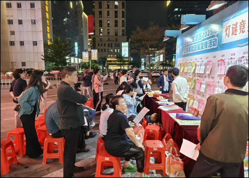 商圈内商户经营者、灵活就业人员及各类务工人员较多,将政务服务从“窗口”延伸至“商圈”,能较高效覆盖群众,让群众在休闲场景中便捷获取政策知识。龙湖区人社局于人流量较多的合胜广场长平店开展了“工伤保险政策宣传活动”。活动现场,由区人社局、社保龙湖分局、区总工会等多部门工作人员组成服务专班,在咨询台为群众提供“一站式”政策解答,针对工伤认定流程、停工留薪期工资发放、一次性伤残补助金申领等高频民生问题,结合实际案例细致解读,同时发放《工伤保险政策指南》、《职工维权手册》等宣传材料200余份,帮助群众清晰掌握权益保障要点。活动还设置了群众喜闻乐见的主题猜灯谜环节,将工伤保险专业知识与人文、神话等话题巧妙融合,吸引了近200人次踊跃参与,让群众在趣味互动中加深对政策的理解,真正实现“寓学于乐”。