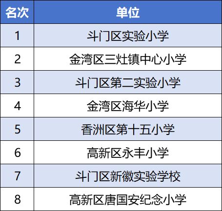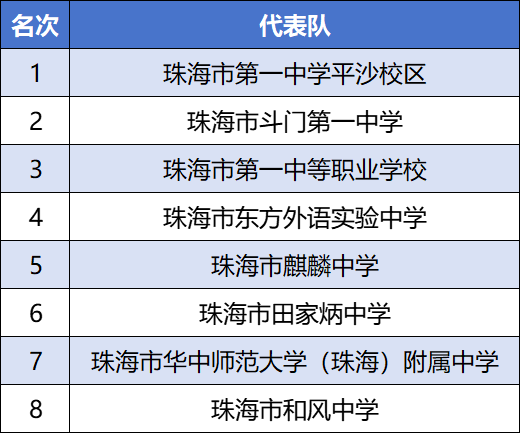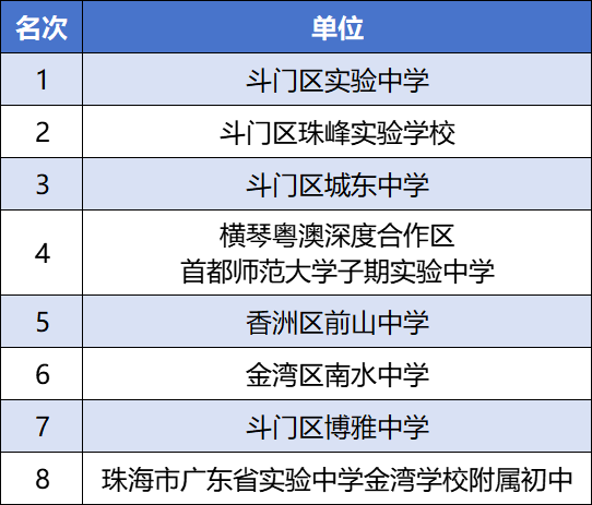 斗门区城东中学 横琴粤澳深度合作区首都师范大学子期实验中学 珠海市南水中学 珠海市金海岸中学 珠海市广东实验中学金湾学校附属初中 珠海市金鼎中学小学组(8个)