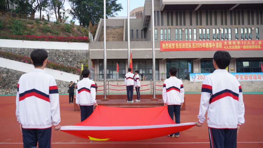 在庄严的国歌声中,五星红旗冉冉升起,现场师生齐声高唱,表达对祖国的热爱。