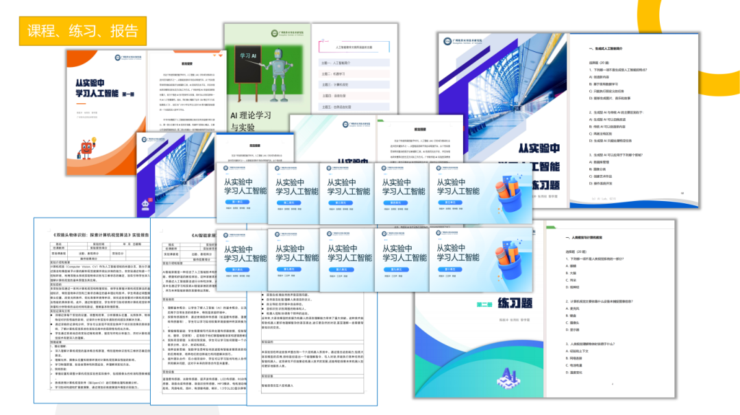 目前,团队已完成小学学段8个单元、初中学段8个单元、高中学段10个单元的课程开发,内容权威覆盖8大AI知识体系,包括:机器学习、计算机视觉、语音分析、NLP处理、生成式AI、机器人、AI伦理与社会、Python编程。同时配套设计多款AI实验项目,旨在助力学生通过实践激发创新潜力,冲刺教育部“白名单”赛事。