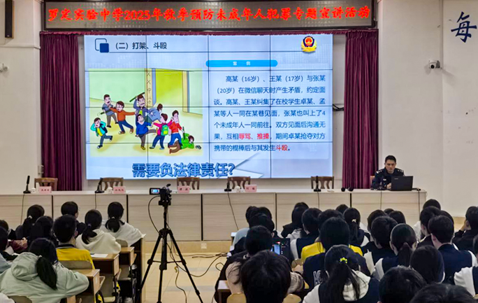 在罗定市廷锴纪念中学,新城派出所民警用“身边事教育身边人”的形式,围绕“预防未成年人违法犯罪”主题,将抽象的法律条文转化为贴近学生生活的具体情境,使法治教育更加入脑入心。同时,结合当前社会热点和青少年身心特点,通过以案释法的方式,深入剖析了未成年人盗窃、聚众斗殴、网络诈骗、学生欺凌等典型案件,不仅揭示了违法行为带来的法律后果,更深刻展现了其对当事人及家庭造成的长期伤害。“我们通过重点解读相关法律法规明确划清法律底线,强调“违法必究、罪责自负”的法治原则,切实破除部分学生中存在的‘未成年就能免责’的错误认知,引导学生树立对法律的敬畏之心。”民警说。