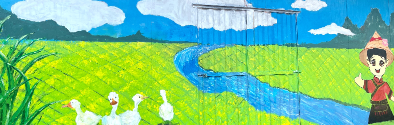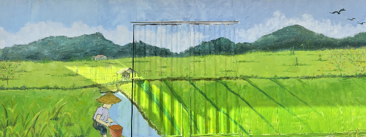 12月23日上午,记者走进位于蓝田瑶族乡社前村的富硒稻种植基地,映入眼帘的是一幅幅色彩丰富、富含乡村气息的田园风光艺术手绘墙画。谁能想到,在不久前,这里还是一片“光秃秃”的墙面?而这一场华丽“变身”则源于一次校地合作——惠州学院服装学院的师生团队携手驻蓝田瑶族乡帮镇扶村工作队共同推进完成了这一作品。是他们将充满生机的丰收场景与瑶族特色文化相结合,让墙面“活”了起来。