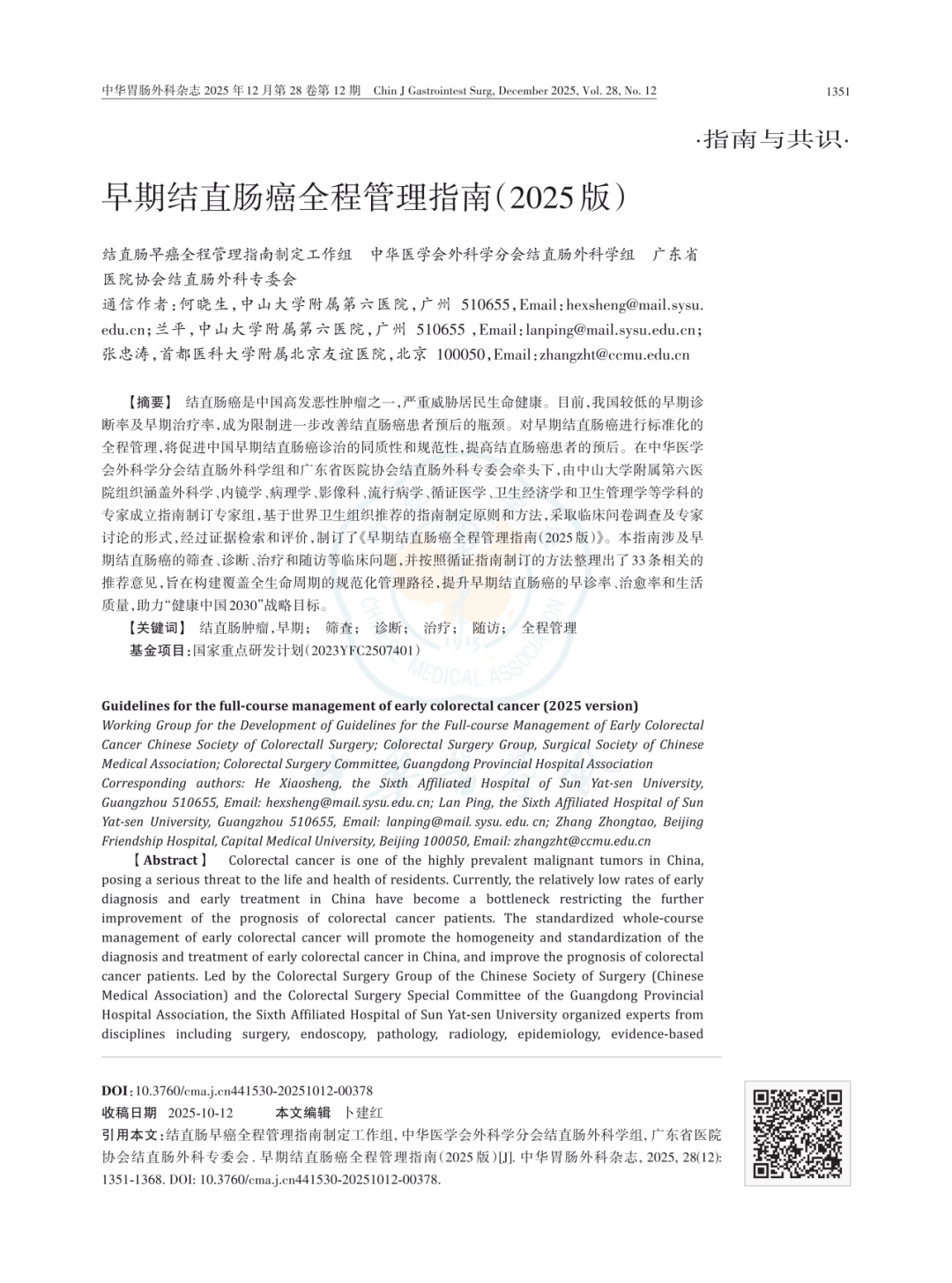 为系统回答这些问题,推动我国早期结直肠癌诊疗向规范化、同质化、精准化迈进,由我院牵头,我院结直肠外科学科带头人兰平教授、结直肠外科六区主任何晓生主任医师联合全国40余位顶尖专家智慧历时近一年精心编撰的《早期结直肠癌全程管理指南(2025版)》,已于12月20日在