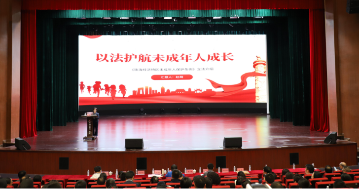 会上,赵萌从立法背景、立法思路、主要内容3个方面,对《珠海经济特区未成年人保护条例》作深入解读,并结合学校日常工作实际,对未成年人保护工作中教育行政部门和学校应履行的职责作重点阐释。赵萌在授课中指出,《条例》聚焦关键,强化控辍保学、班主任、教育惩戒、法治副校长、欺凌防控5项制度,并注重保护关口前移,强调加强对新兴业态的监管,将全方位多层次促进全市未成年人保护工作提质增效。